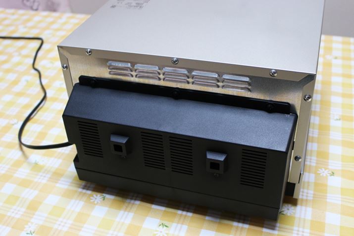 本体背面にある排気口のほうから、何かが稼動する音が聞こえました。「脱臭・脱煙機能」をオンにすると、熱でニオイを焼き切るといった作動が始まるそう。その半面、ニオイに対して熱を与えるため、食材に焼きムラが生じることもあるとのこと