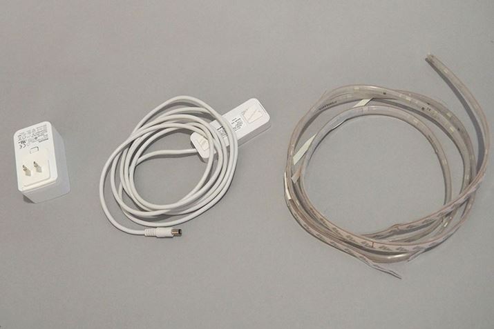 ライトリボン プラスは発光部のリボン部と電源コード、アダプターの3パーツを組み合わせて使います。電源ケーブルが長いので取り回しはしやすい