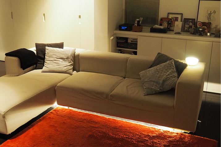 リビングのソファの下にライトを設置してみました(写真下)。間接照明があるだけで、かなり部屋の印象がおしゃれになります。しかも、移動時に足下が見えて便利