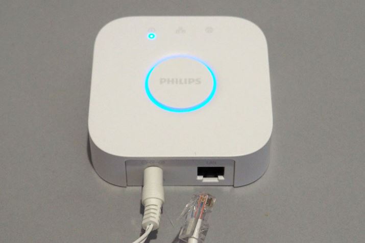 Hueシリーズの照明の親機となるHueブリッジ。これひとつで50個までの照明をスマートフォンで操作できます