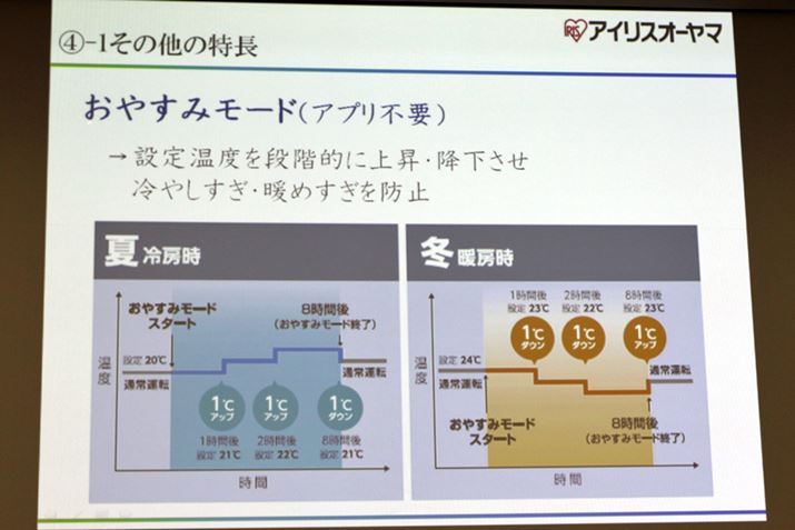 アプリにある「睡眠モード」ほどの細やかな設定はできませんが、スタンダードシリーズでも「おやすみモード」は使えます。おやすみモードをオンにしておくと、就寝時に冷やしすぎや暖めすぎを防ぐ温度帯に自動で調整