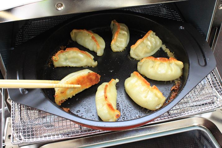 冷凍餃子も280℃設定・10分ほどでこんがり。全体に熱が回るので、上部も薄く焼き色が付いています。このあたりは、設定温度を調整して好みの焼き具合をめざしたいところ