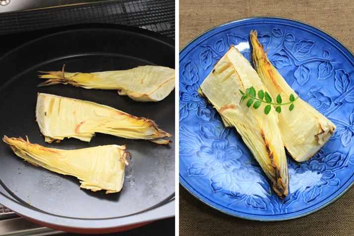 旬の食材も使ってみました。家庭用のコンロで作ろうとすると難しい焼きたけのこが、グリルパンに乗せるだけで香ばしくサクッとできあがります。調理の設定は260℃で10分ほど