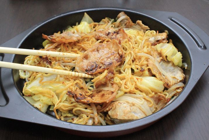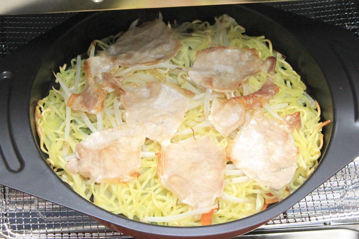 焼きそばは、野菜を下に敷いて、上に麺と肉を乗せたらあとはフタを閉めて加熱するだけ