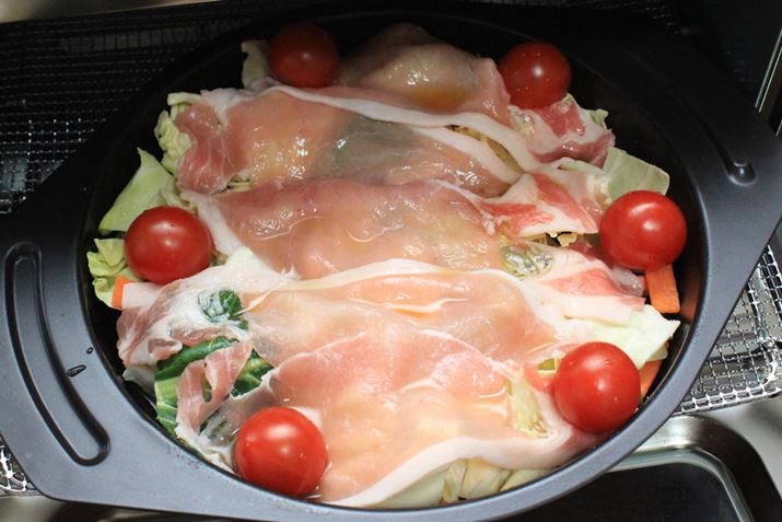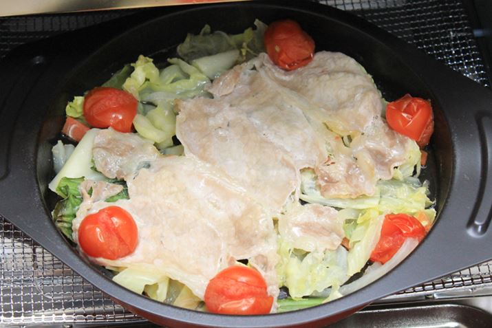 野菜の水分を使うかたちで、簡易的な蒸し調理も。野菜を敷いて豚肉を乗せたら、280℃で5〜6分加熱するのみ。筆者はこの肉と野菜の蒸し焼きにハマり中です。いろいろな野菜×肉のバリエーションを楽しみたい