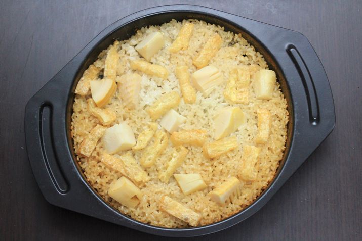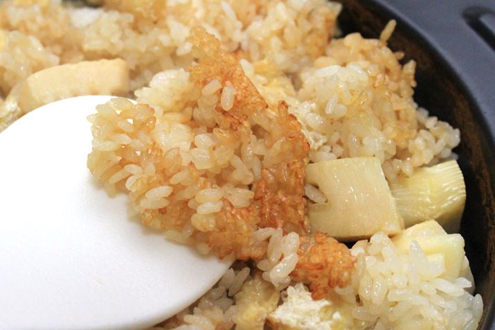 ものは試しとやってみたら、生のお米からご飯を炊き上げることもできました。たけのこご飯を作ってみたのですが、もちろん材料を一気に入れるだけでイイので、とにかく簡単! お米がふっくらおいしく炊き上がり、均一に熱が伝わっている効果を実感できます。しかも、熱いグリルパンのおかげで、“おこげ”がばっちり作れるのがうれしいところ。