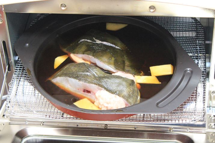カレイの煮付けは、先に煮汁だけを温めておき、後からカレイの身とショウガを入れて調理開始します。調理時間は260℃設定で14〜15分ほど。フタを閉める前にアルミホイルを乗せれば、落としぶた代わりになってくれます。こちらも、完成後に10分ほど放置しておくことで、煮汁を染みこませれば、ふっくらおいしく完成