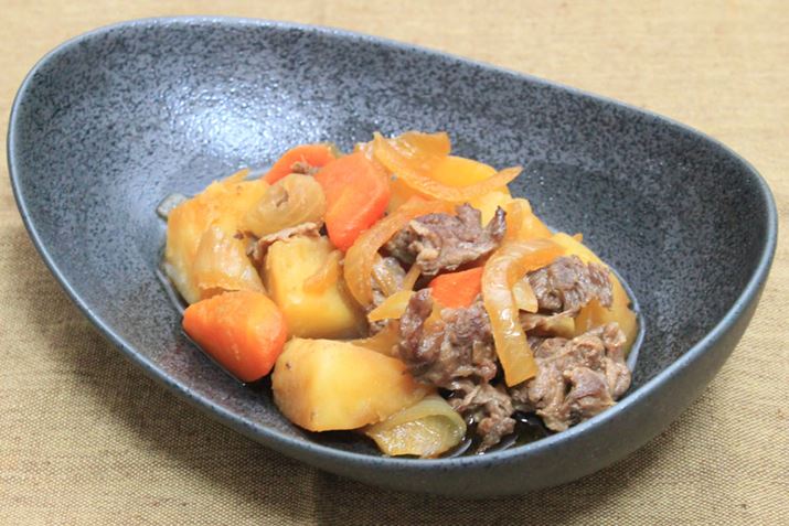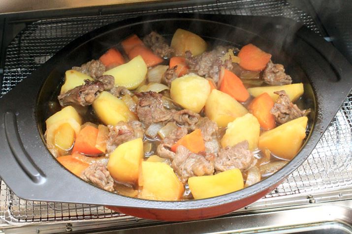 炒めないで作る簡単な肉じゃが。煮汁に野菜と肉を入れて、260℃設定で10分ほど調理するだけです。最後に10分ほどそのまま置いておけば、冷めて味が染み込んでいき、おいしくできあがります