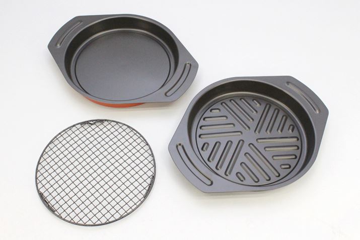 これが付属のグリルパンとグリルネット。今回はこれを使ってあれこれ料理してみます。グリルパンは、内側が耐熱シリコン塗装されていて、波型モデルと平面型モデルが付属。それぞれがフタの役割も兼ねていて、波型グリルパンを使うときは平面グリルパンがフタになります。もちろん、その逆もOK