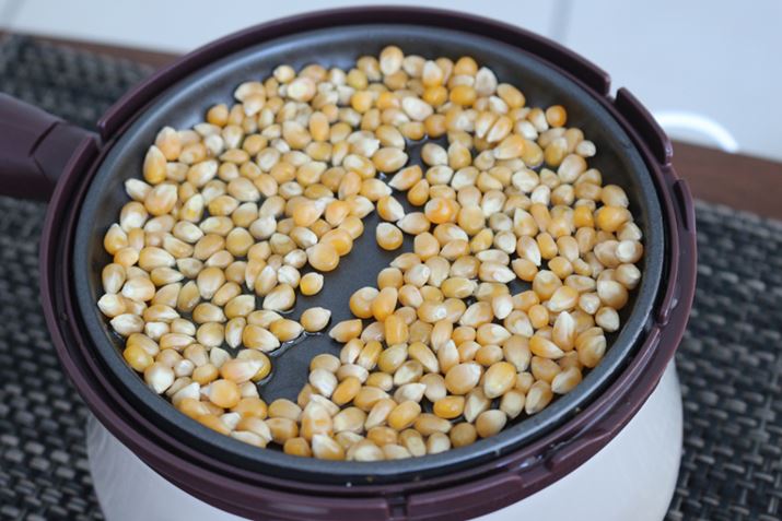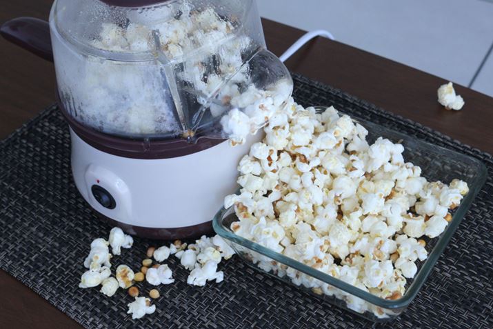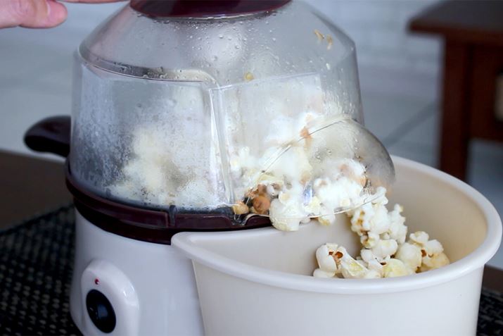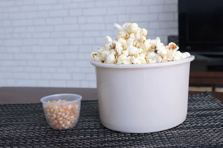 それでも容器からあふれてしまうのはご愛嬌ということで。途中でできあがったポップコーンの高さをならしたり、下にランチョンマットなどを敷いておくといいですね