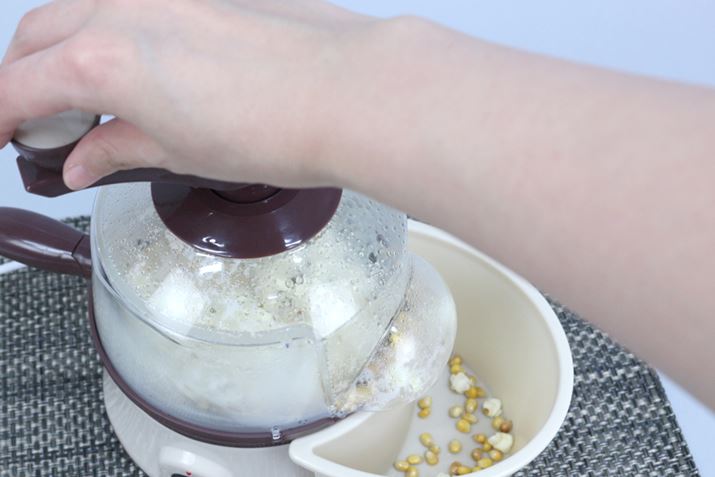 本体にポップコーン用のふたをかぶせたら、出口に専用ボウルをセットし、電源スイッチオン。1分半ほどでプレートが熱くなり、コーンが弾け始めます。本体内にポップコーンが溜まってきたところでハンドルをくるくる回すと、出口からポップコーンがポコポコと飛び出すはずですが……。