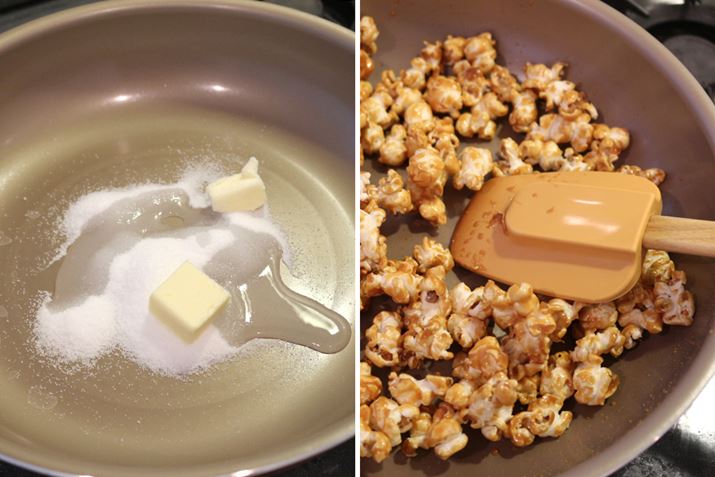 砂糖とバター、水を溶かして熱し、きつね色になったところでポップコーンを投入。まんべんなくキャラメルをからませます