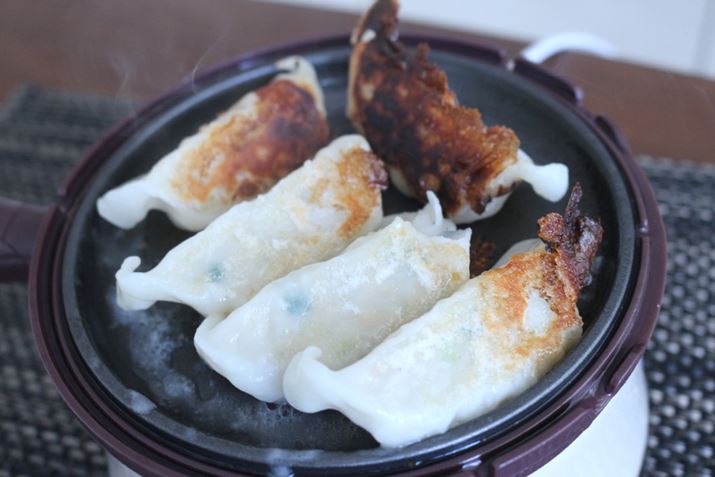 冷凍餃子なら5個ほど並べることができます。ホットプレートが小さいせいか、すごく大きな餃子のように見えます