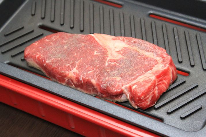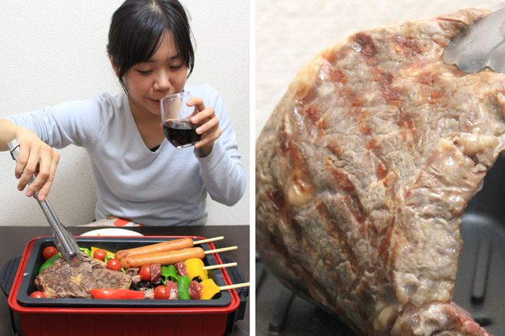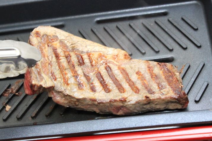 いよいよ、バーベキュープレートを使って、ぶ厚いステーキ肉を焼いてみましょう。高いパワーで一気に表面を焼き上げるいっぽう、いらない油はカットされて落ちていくので、お肉にうま味が凝縮されます。さらに、焼き目が付くのが魅力的! 普通のフライパンで焼いたステーキと比べて、一層おいしそうな見た目に仕上げることができます。