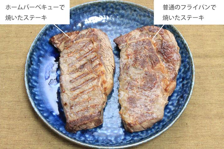 普通のフライパンで作ったステーキ(右)と比較すると、こんなに見た目が違う! ホームバーベキューで焼いたステーキ(左)のほうが明らかにおいしそうです。やはり見た目は大事ですね