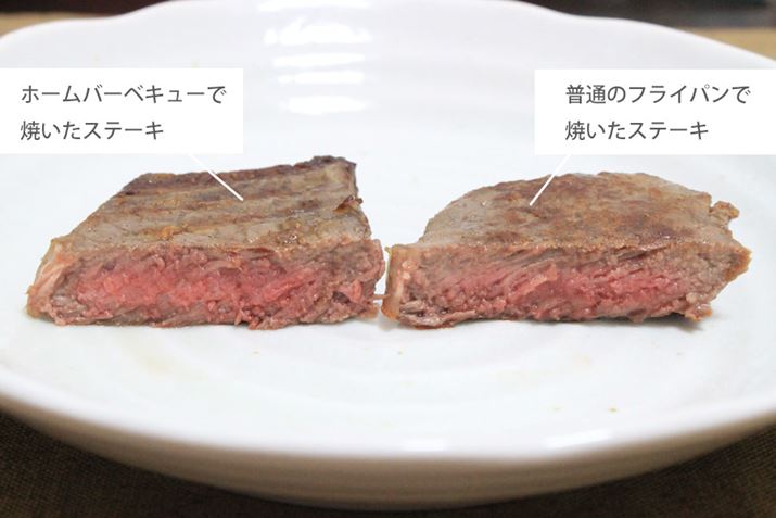 普通のフライパンで焼いたステーキ(右)は、表面に少しでも焼き目を付けようと頑張ったら、内部にも火が浸透して硬くなってしまいました。対して、ホームバーベキューで焼いたステーキは、高火力で一気に焼き目が付きつつ、中身はしっとりとレア感をキープしています