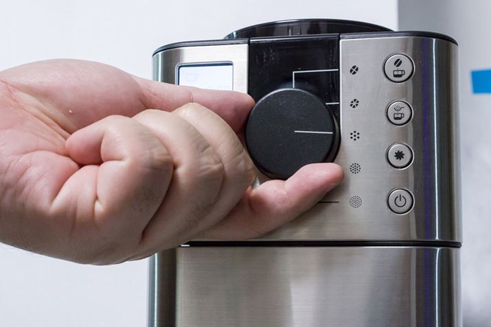 豆の挽き方は「粗挽き」「中粗挽き」「中挽き」「中細挽き」「細挽き」の5段階から選択可能。ミルダイヤルの隣にあるボタンは上から「豆からボタン」「粉からボタン」「ミルボタン」「ON/OFFボタン」となる