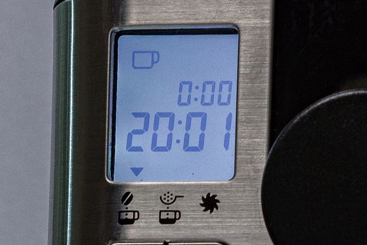 液晶は左上にカップ数のアイコンを表示。その下がタイマー用時計で、大きな数字は現在時刻。下部の▼の位置で、「豆から」「粉から」「ミル機能のみ」のいずれを選択しているか確認できる