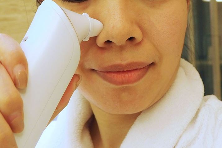 「角栓クリア」は主に角栓をケアするので、推奨されているケア部位は鼻と小鼻、そしてあごの3か所です。鼻などは凹凸が多い場所ですが、噴射口に柔らかなシリコン製のノズルが装着されているため、使い勝手は意外と良好。小鼻など普段は丁寧にケアしにくいエリアも、ラクに水流を当てることができました。