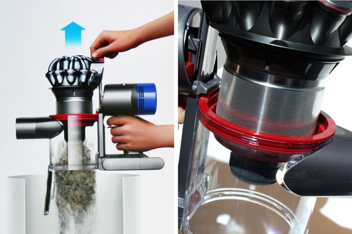 ゴミ捨てはレバーを引き上げるだけ。サイクロン部が上にスライドし、その際、クリアビン上部にあるゴム(赤い部分)が網目の部分に付着したゴミをこそぎ落としてくれます