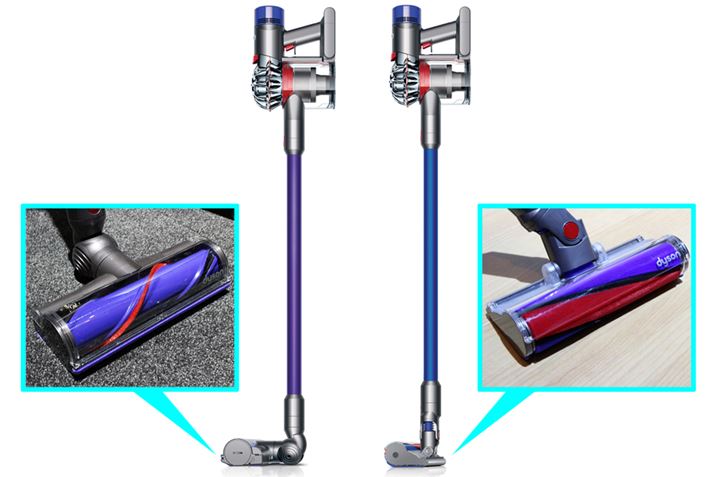 吸引力はエントリーモデル「V6」と同じと前述で記しましたが、清掃性能は吸引力だけで決まるものではありません。ヘッドやブラシが違えば、ゴミの取れ具合も変わります。実は、「V7」のヘッドは「V6」とは別物。基本構造は「V8」にならっているので当然ですが、ヘッドも「V8」で用意されていた「ダイレクトドライブクリーナーヘッド」と「ソフトローラークリーナーヘッド」が選べるようになっています。