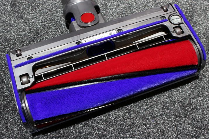 カーペットの掃除に強い「ダイレクトドライブクリーナーヘッド」には、2種類の異なるブラシが装備。カーボンファイバーブラシ(黒)が静電気を抑え、硬さのあるナイロンブラシ(赤)でゴミをかき出しながら走行することでしっかりゴミを取り込みます