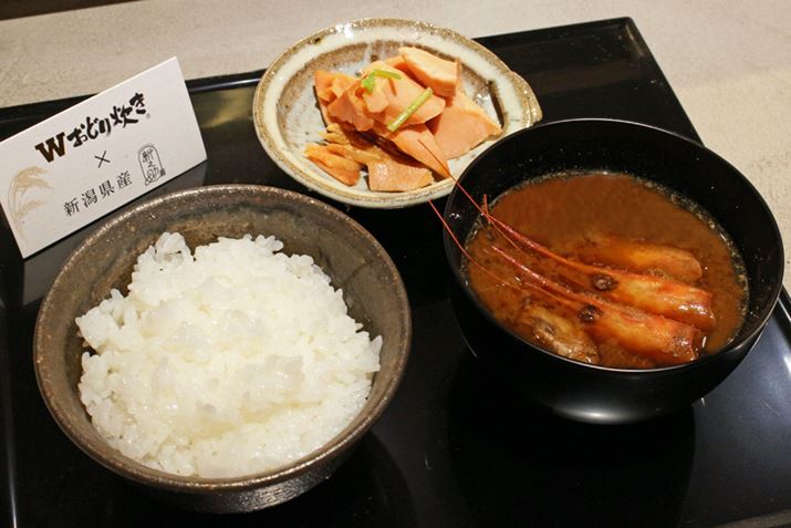 「新潟・新之助御膳」には、極上熟成塩引き鮭と、越後味噌を使った南蛮えび頭のみそ汁がつきます。価格は一膳500円(税込)で、各御膳1日30食限定。ごはんは無料でお代わりできます
