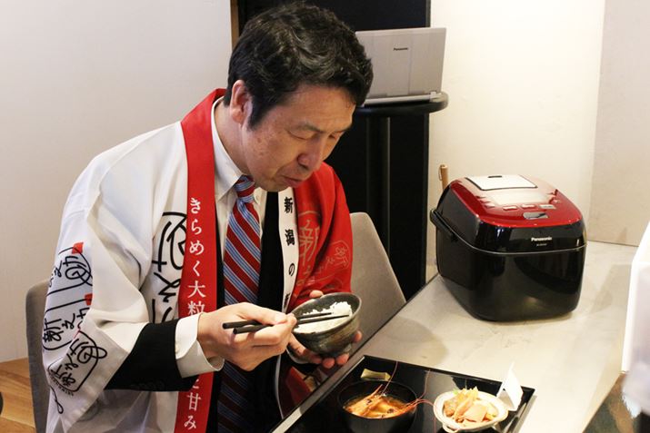 新之助の味はすでに知っている米山知事ですが、今まで食べてきた新之助とは違ったようで、ひと口食べてあまりのおいしさに表情が瞬時に変わりました。いい米を用意するだけでなく、炊飯器もあわせてよいものを揃えたほうがいいと実感したようです