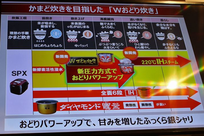 「Wおどり炊き SR-SPX7」シリーズの炊飯は、かまどで炊く工程を再現。この炊飯方法は銘柄が変わっても、同じです