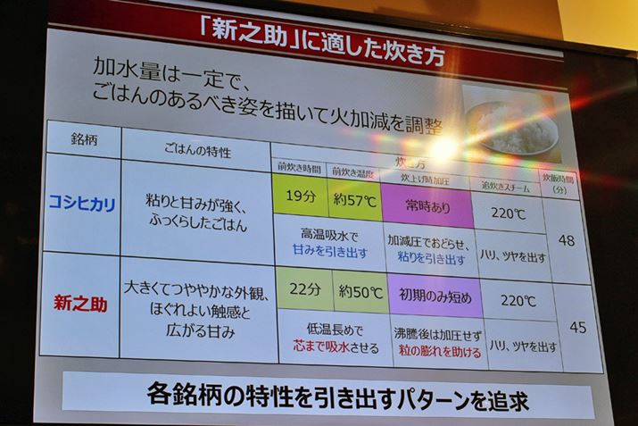 米山知事が「おいしい!」と思った秘密は、「Wおどり炊き SR-SPX7」シリーズに搭載されている“新之助に最適な炊飯コース”にもあるかもしれません。「Wおどり炊き SR-SPX7」シリーズには、さまざまな銘柄にあわせてプログラミングを変えた炊飯コースが用意されており、この「至高の一膳 食べ比べ亭」で提供されるごはんは、それぞれの米にあわせた銘柄炊き分けで炊飯されています。