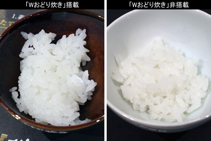 パッと見た感じは違いがわかりませんでしたが、香りを比べてみてビックリ! 「Wおどり炊き」で炊いたごはんは米の香りが強くするのに対し、非搭載で炊いたごはんは「無」というぐらい何もニオイがありませんでした