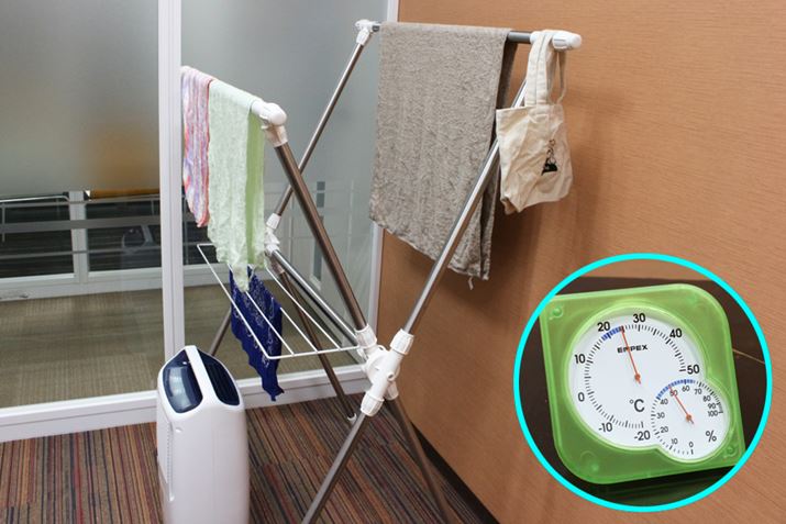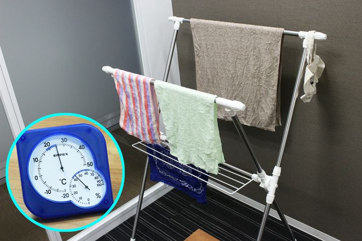 比較のため、別の部屋にもまったく同じ種類、配置の洗濯物を用意しました。こちらの部屋には除湿機はありません。室温を湿度を調べてみたところ、隣接しているにも関わらず、空調の影響か、こちらの部屋のほうが湿度が6%も低い! 洗濯物の乾燥には有利です