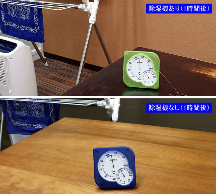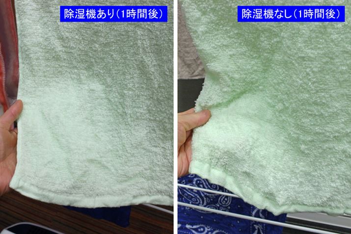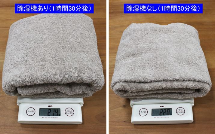なお、洗濯物を干してから1時間後では濡れていたバスタオルが、1時間30分後には乾いていました。ただし、除湿機のない部屋に干したバスタオルは裾の分厚くなった部分が、まだ濡れており、ジメッとしています