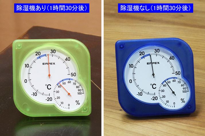 バスタオルを乾かすべく、さらに30分放置。洗濯物を干してから1時間30分後の室内は、タシューゴのある部屋は室温が2℃ほど上昇しましたが、湿度はスタート時よりも6%下がり44%になっていました。いっぽう除湿機のない部屋の湿度は46%。スタート時は45%だったので、除湿機がないとやはり湿度上昇は防げないようです
