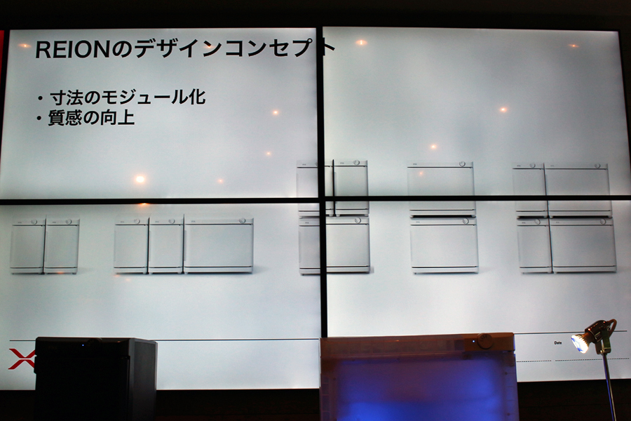 まずは、パッと見て感じるこれまでとの違い、「デザイン」を見ていきましょう。従来の冷温庫は、正直、見た目は度外視されており、デザインで物欲がそそられるようなモノではありませんでした。REIONはそんな印象を刷新! デザイナー・アートディレクターの小関隆一さんの手によって、空間になじむ主張しないデザインながら、洗練されたインテリアのような質感と外観になりました。また、2種類のサイズがラインアップされるのですが、異なるサイズのREIONを並べたり、積み重ねたりできる設計になっているのもポイント。増設もスマートに行えます。