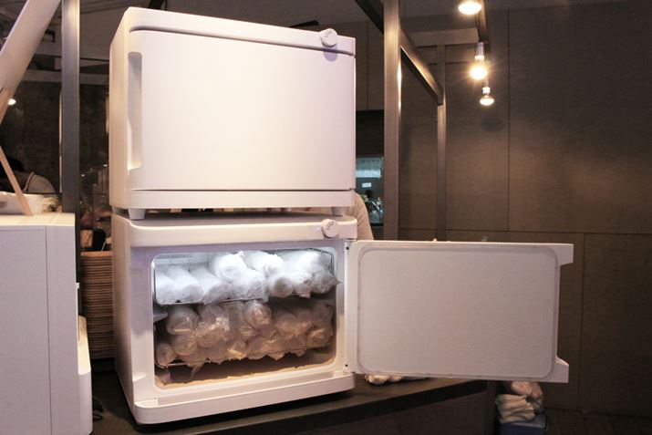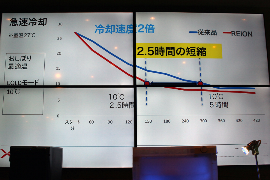 いっぽう、冷却もスピードアップ! 10℃のおしぼりを作るのにかかる時間は従来の半分、2.5時間で済みます
