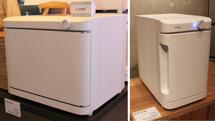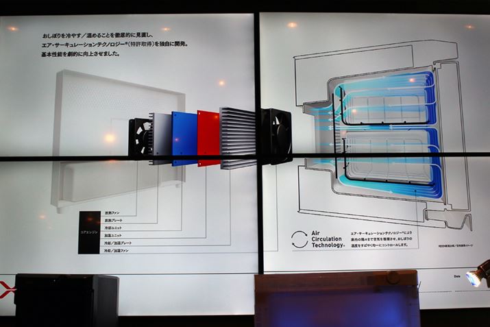 REIONは本体背面に、冷却ユニット(ペルチェ素子)と独自開発した加熱ユニットを配置。この装置で適切な温度制御を行い、ファンにより庫内の空気を均一に循環させます。なお、冷温機構を背面に集約したことで、たとえ故障しても修理が容易になりました