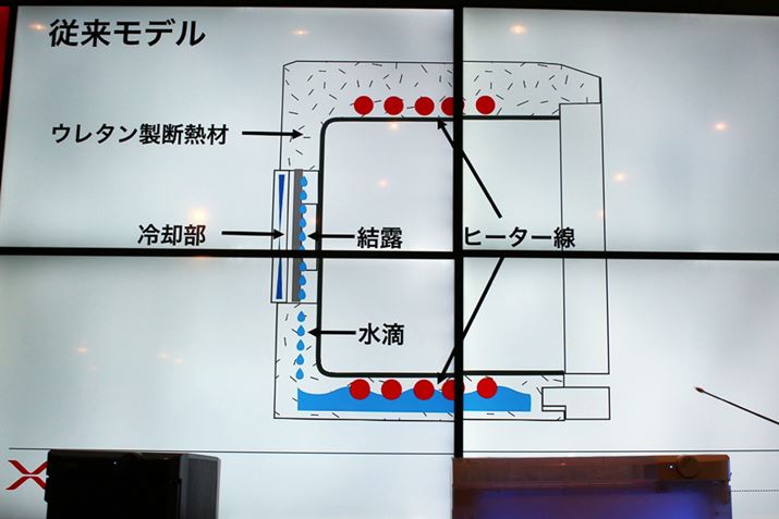 従来の冷温庫は本体背面に冷却部(冷却用の半導体・ペルチェ素子と送風するためのファン)が、温めを行うためのヒーター線が庫内を囲うように配置されていました。このような構造のため、冷却運転時に生じた結露が水滴となってヒーター線にかかり、ショートすることも。温めを行おうと運転をした時に、故障していることに気付くため、特に秋〜冬にかけて故障が多発していたといいます
