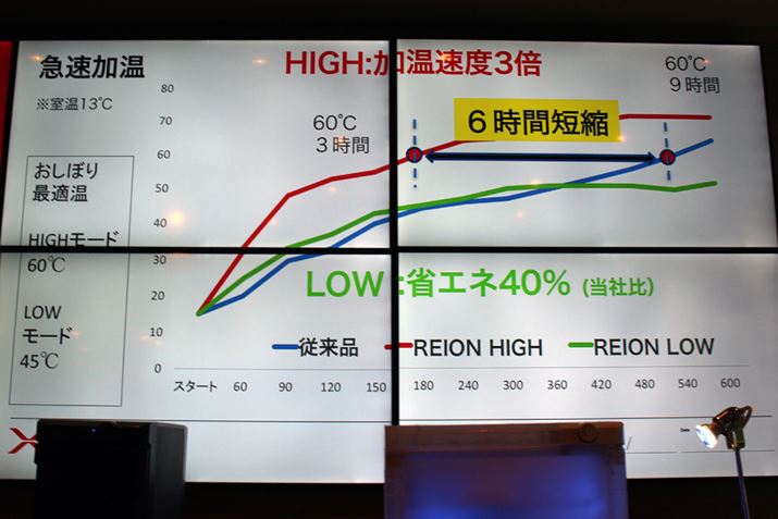 空気循環型冷温システムの採用により、従来は60℃におしぼりを温めるのに9時間かかっていましたが、REIONでは3時間に短縮。さらに、45℃のおしぼりになる「LOWモード」を利用すれば、従来よりも約40%も節電できます