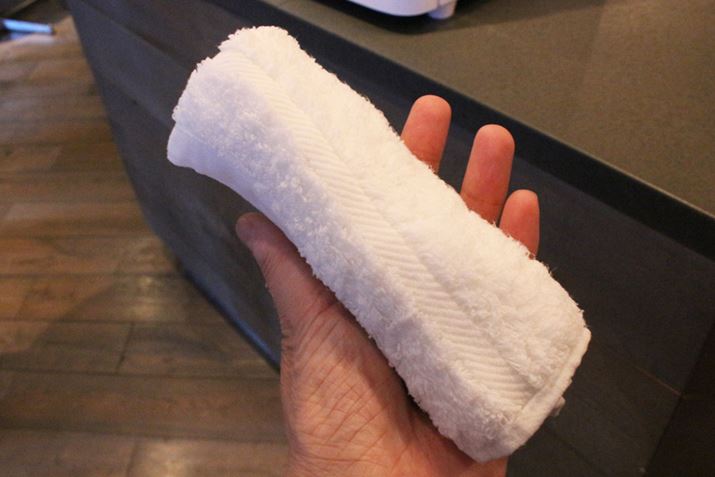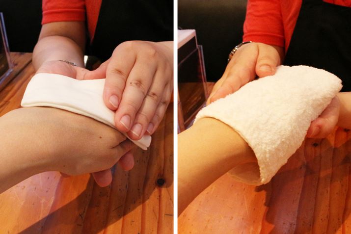 ヒアルロン酸とフルボ酸エキス入りの紙おしぼりで手を拭いたあと、温かいおしぼりで包めばハンドスパに! 肌のしっとり感が増したような気がします