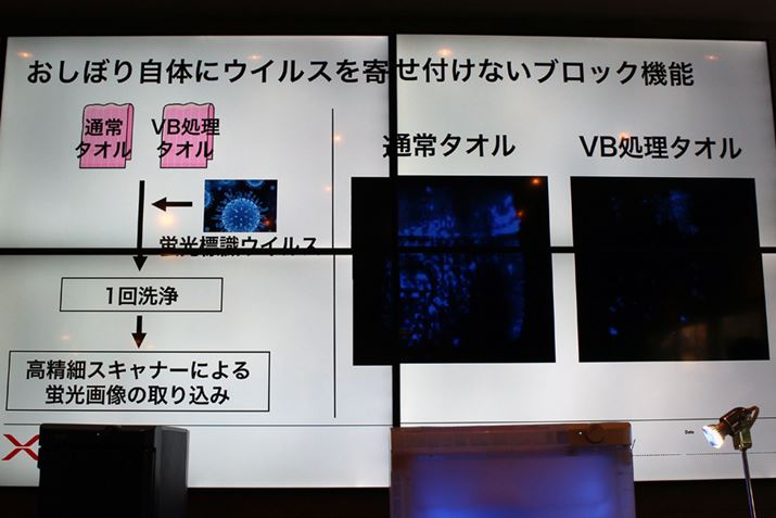 VB処理を施したタオルと普通のタオルにウイルスを付着し、1回洗浄。洗浄しても何も処理をしていないタオルにはウイルスがいっぱいです