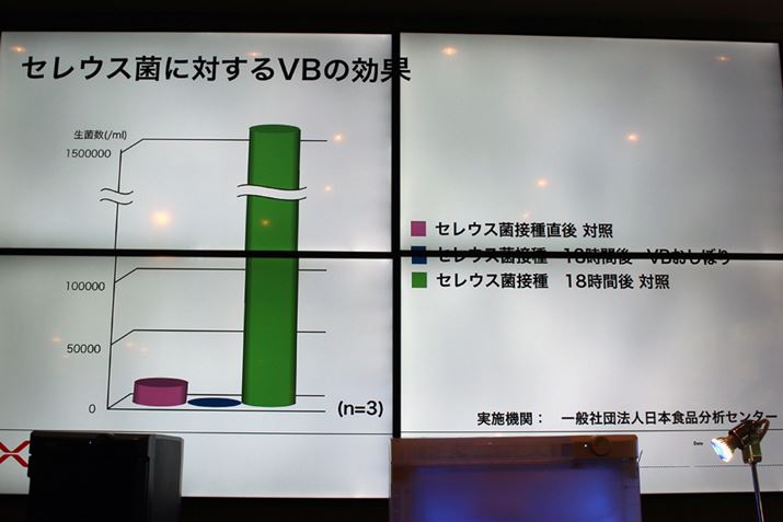 食中毒を引き起こすセレウス菌をタオルにつけて18時間培養した結果のグラフ。VBおしぼり(青色)は、セレウス菌付着直後よりも菌が減っています! セレウス菌は加熱した食品にも存在する菌なので、手からの媒介低減に効果的なのは魅力ですね