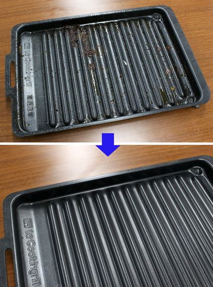 魚を焼いたあとのグリル皿も、パワフルコースでキレイに! こびり付いた魚の皮もきちんと洗い落とされました