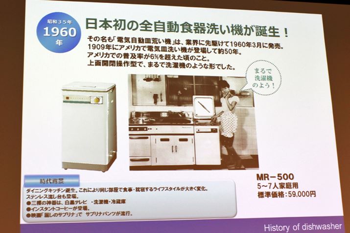 日本国内に初めて登場した全自動食器洗い機「MR-500」の価格は59,000円。この価格は当時の大卒の初任給(16,000円)の4倍弱と、かなり高額であったことからなかなか売れなかったそう
