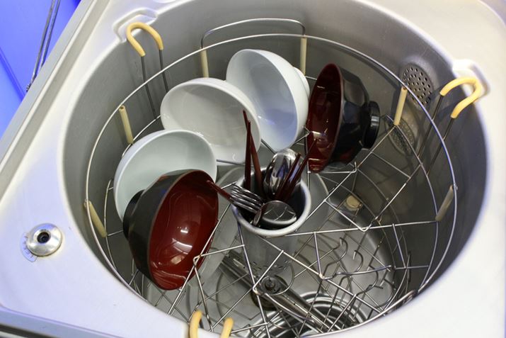 お茶碗やお椀は入れやすそうですが、大きめの平皿はセットしにくそう。なお、洗剤も食器の上からふりかけて投入します。昔の縦型洗濯機の使い方と似ていますね