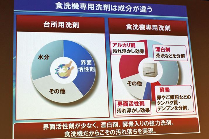 漂白剤や酵素が含まれていない台所用洗剤は、手のチカラで汚れをごしごしと落とさねばなりません。いっぽう、食洗機用洗剤は汚れを分解して除去する成分が入っているため、手洗いで苦労していた汚れも落ちやすいのだそう