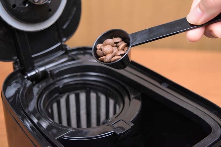 実際にコーヒーを淹れてみよう。まずは本体上部のカバーを開け、付属の計量スプーンで豆もしくはコーヒー粉をメッシュフィルターの内側に投入する