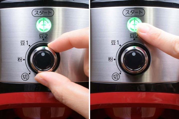 豆を入れ、水もセットしたら本体正面のダイヤルでモード(粒度)を選択。粗挽きの場合は「豆1」、中挽きの場合は「豆2」、コーヒー粉からドリップするときは「粉」を選ぶ。これで準備は完了。スタートボタンを押せば運転が開始される