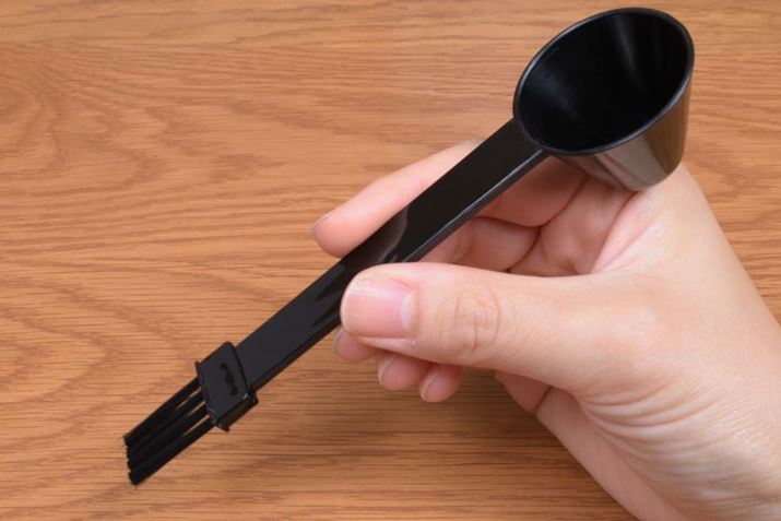 気の利いた作り込みは掃除用のブラシにも。計量スプーンの柄の先端に掃除用ブラシが付いているので、「どこにしまったっけ?」とあちこち探し回らずにすむのだ