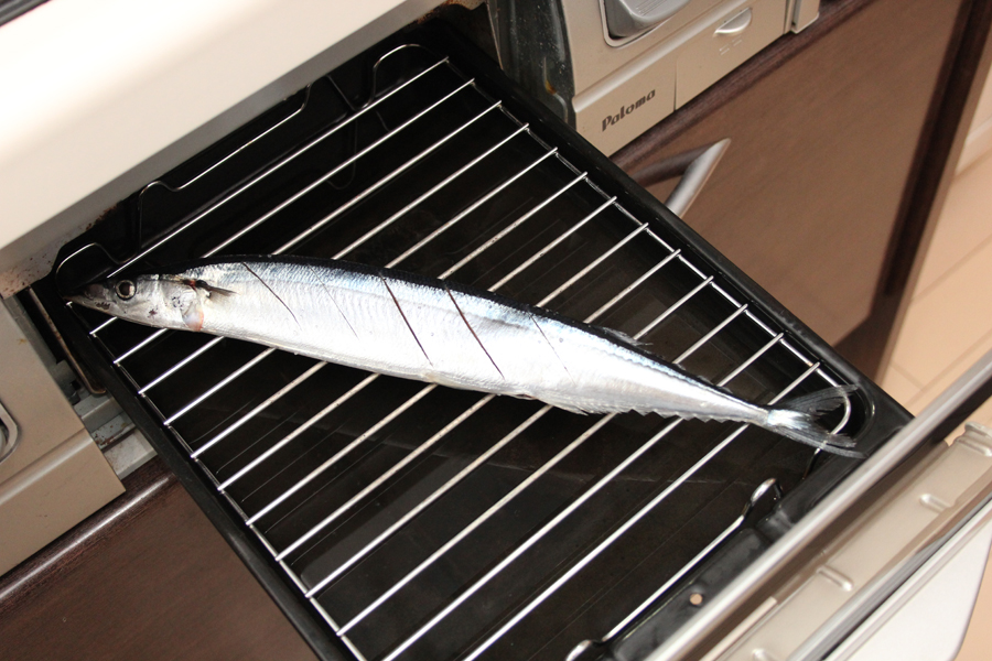 ここまで肉を焼いてきて、グラファイトグリラーのウリであるニオイと煙の少なさはかなり優秀。そこで、ニオイと煙が強烈な焼き魚を試してみることにしました。味も比較したいので、ガスコンロに搭載されている魚焼きグリルと対戦! 季節外れではありますが、サンマをゲットすることができたので、サンマの塩焼きで対決です。まずは、魚焼きグリルで焼いてみましょう。